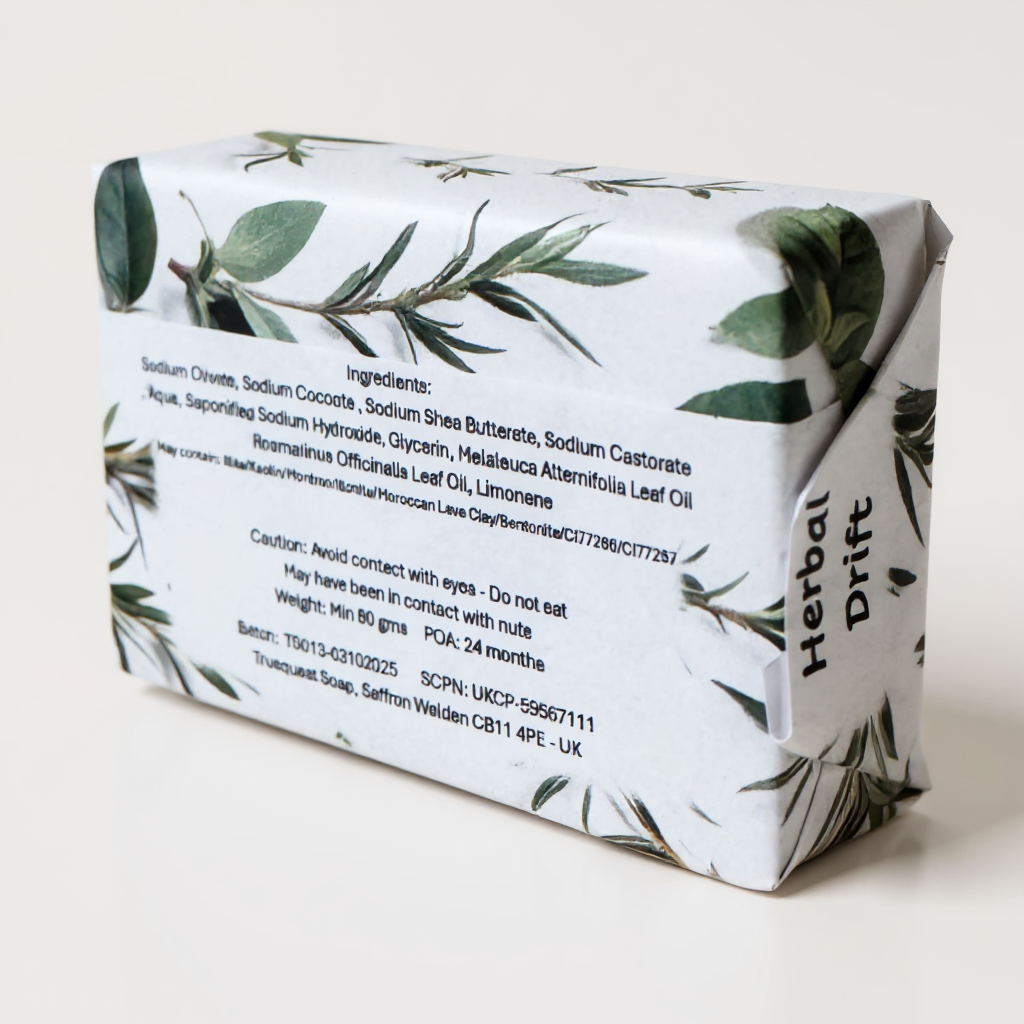Olive Oil, Coconut Oil, Shea Butter, Castor Oil, Water, Lye, Glycerin. Tea Tree Essential Oil, Rosemary Essential Oil
