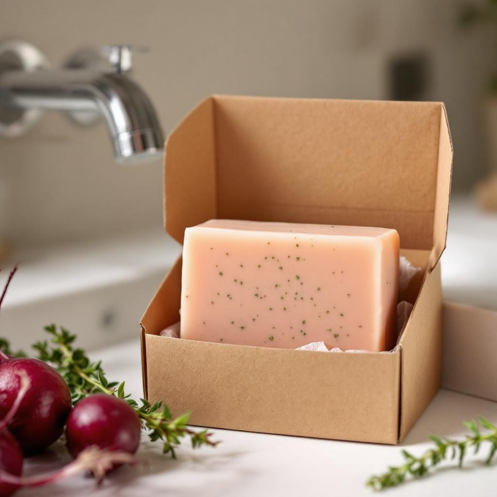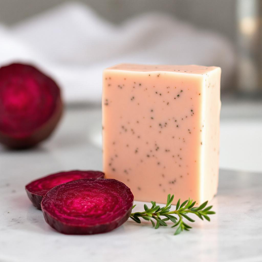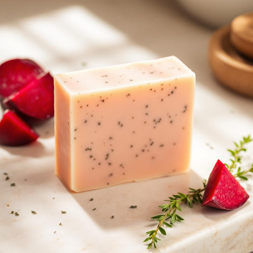 Coloured naturally with beetroot and thyme, this bar carries a muted mauve or dusky rose hue—born from beetroot’s anthocyanins and thyme’s chlorophyll-rich leaves. Together, they offer a gentle infusion of colour and a whisper of garden-grown goodness.